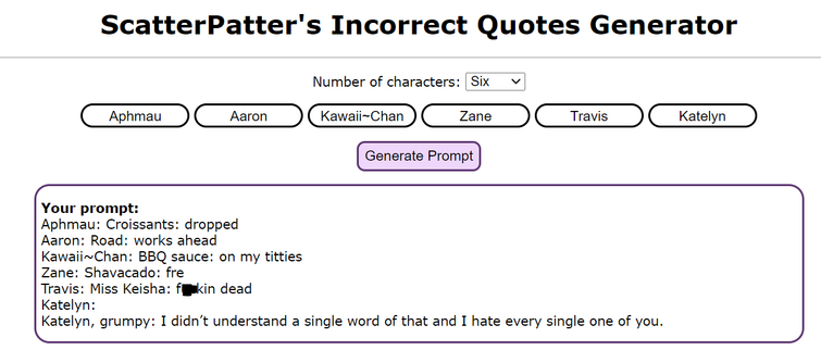 Scatterpatter S Incorrect Quotes Generator Number Of Characters Two Generate Prompt Your Prompt Isabelle Slayer Why Did You Draw A Pentagram On The Floor Slayer Your Text Told Me To Satanize The House from imageproxy.ifunny.co In the future i plan to implement a feature to filter out prompts that involve shipping, but until then i apologize if any. (they will get import errors). Scatterpatter\'s incorrect quotes generator ~ some stuff incorrect quotes ft mark amy ethan sean and evan wattpad. If you change it, the old url will no longer work! If you like incorrect quotes, i made a website where you can generate some with your characters (updates with new prompts whenever i feel like it) incorrect quotes generator faq. Some prompts may imply shipping between 2 or more characters. Since using scatterpatter s incorrect quotes generator is getting popular i decided to make a battle cats one story 1 scars from powercreep fluff battlecats. This generator is not meant to imply any adult/minor, abusive, incestuous, or otherwise problematic ships.
